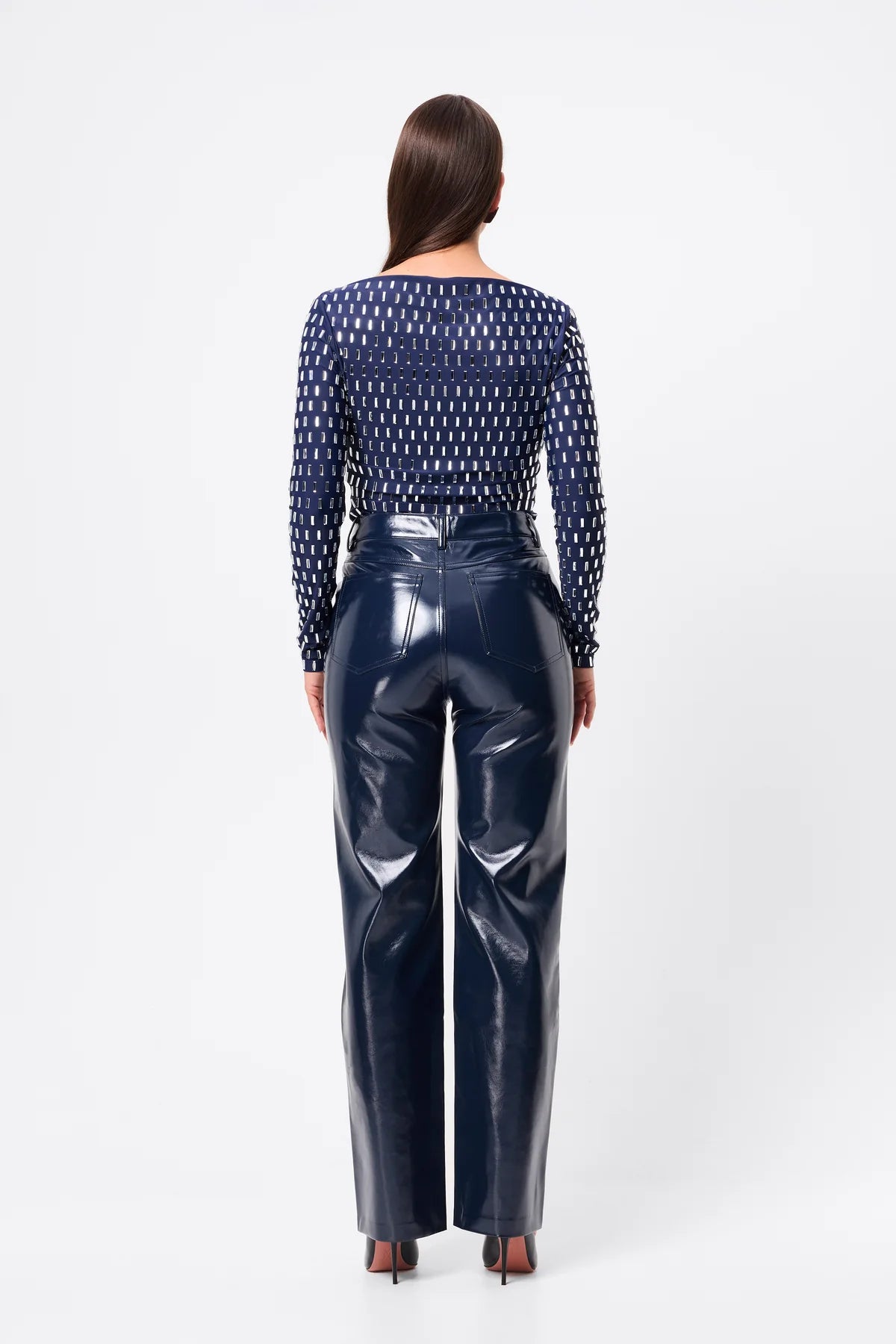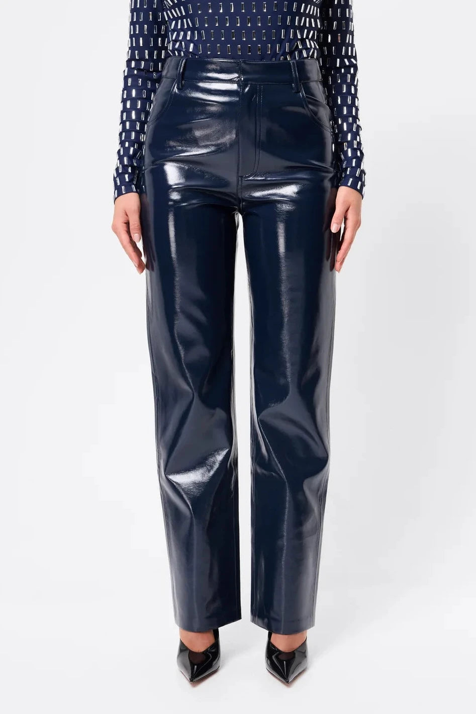 The Dawn On Me Pant delivers a bold, modern silhouette crafted in a high-shine midnight blue vinyl fabrication. Designed to sit high on the waist, this sleek style sculpts the leg with a clean, streamlined finish that feels both powerful and refined. The glossy surface elevates everyday dressing, making these pants equally suited to statement evening looks or directional day styling. Pair with the matching jacket for a striking, head-to-toe moment.