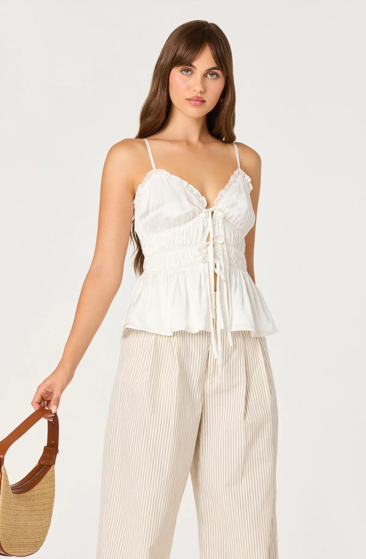 Feminine and romantic, this tiered peplum top boasts ruched detailing, ruffle trim, and an artfully structured bodice. An elasticized back ensures a comfortable