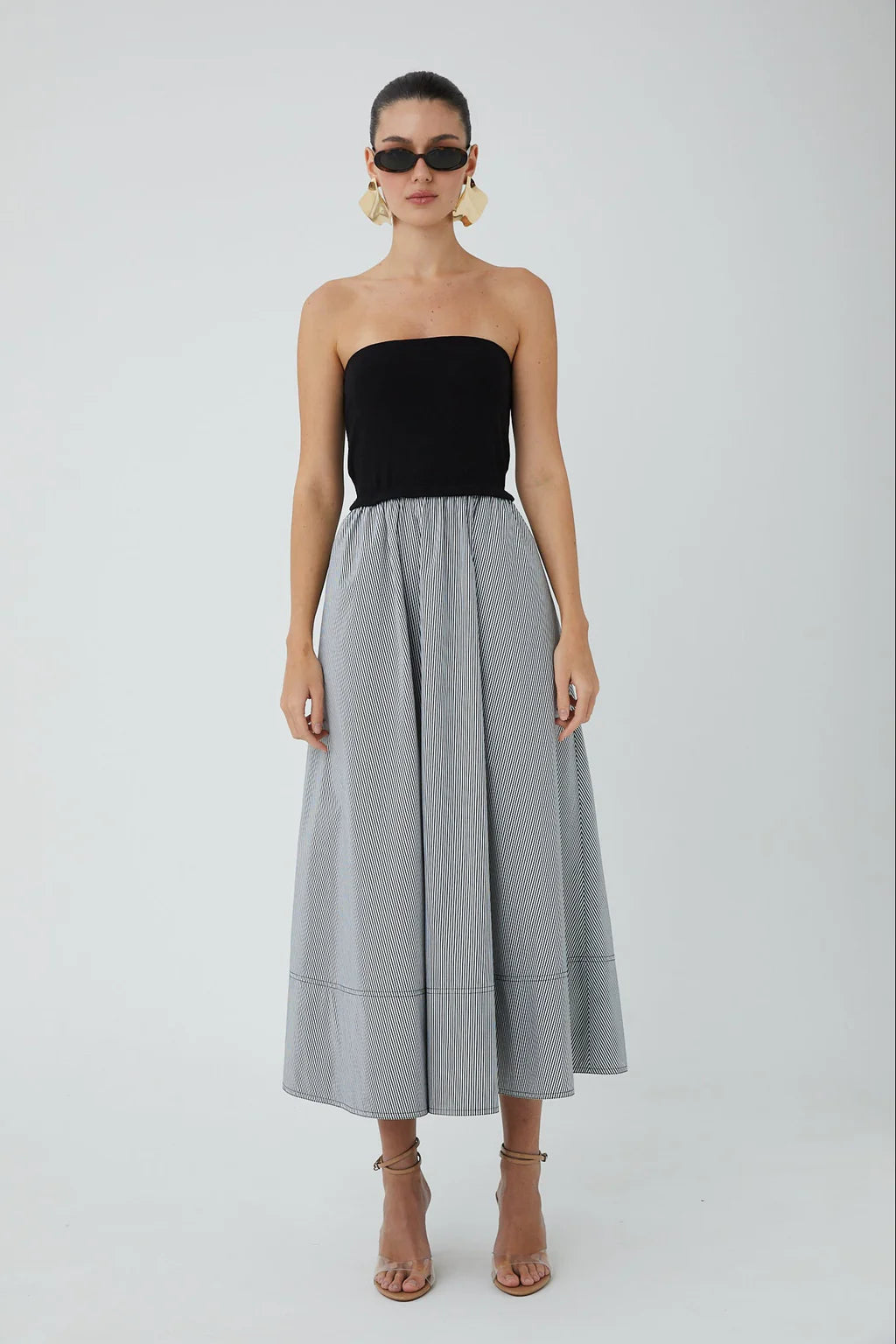 The Kieran dress is a versatile piece that effortlessly elevates your style. Simply slip it on for a chic and sophisticated look. The ribbed stretch top provides ultimate comfort, while the flared striped skirt adds a touch of elegance with its crisp cotton poplin material. The delicate stripes create a beautiful contrast against the solid black top, making it a perfect option for a stylish cover up during your next vacation.