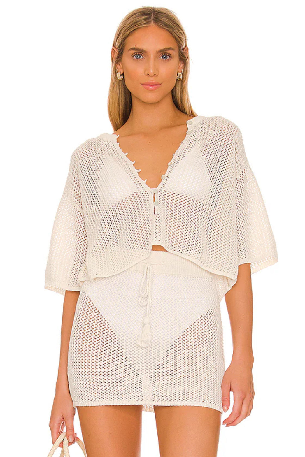 two piece, crochet skirt and button down top cover set