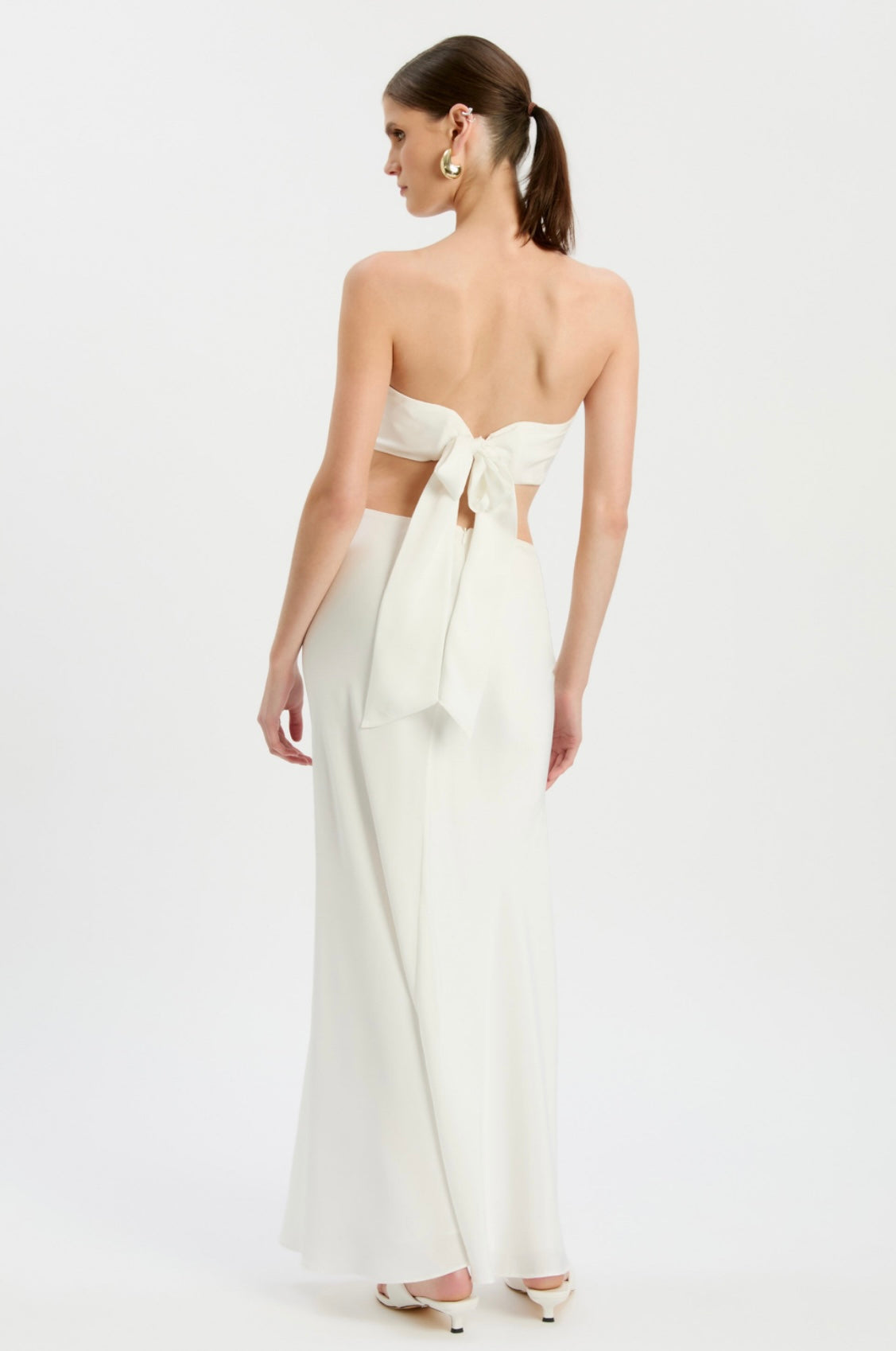 The Dylan Set captures seaside glamour with its sculpted detailing and fluid movement. Bias-cut for a graceful drape, it sits high on the waist and flows to a floor-skimming length. A polished stone hardware accent at the hip gathers the fabric into soft cascades, opening to a daring front split.